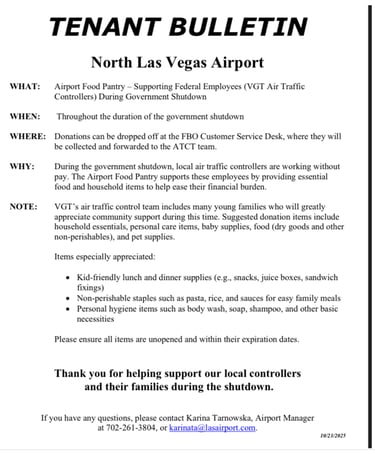 Additional donations can be dropped off at the food donation box located in the terminal near the service desk at North Las Vegas Airport. Every contribution helps support our tower team and their families during this time.